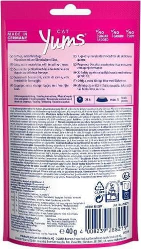 Vitakraft Cat Yums® Käse sind saftige Katzensnacks mit Käsefüllung. Die Häppchen werden schonend im Ofen gegart und enthalten keine Zusatzstoffe wie Zucker, Getreide oder Soja. Sie sind besonders fleischreich und eignen sich als Belohnung oder Snack zwischendurch.