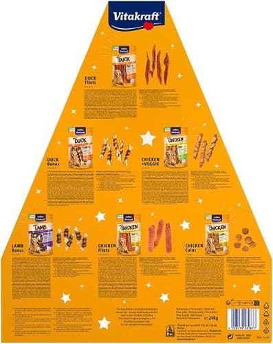Auch in diesem Jahr können sich kleine und große Hunde wieder auf den Vitakraft® Adventskalender mit 24 köstlichen Überraschungen freuen. Hinter jedem Adventstürchen warten herzhaft fleischige Snacks, die den Vierbeinern die Zeit bis Heiligabend versüßen und das Hundeherz höher schlagen lassen. Ideal zum artgerechten Verwöhnen und Belohnen.