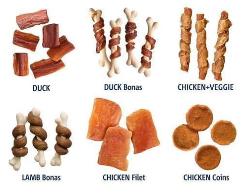 Zutaten: CHICKEN Coins: Hühnerfleisch 95%, Pflanzliche Nebenerzeugnisse, Pflanzliche Eiweißextrakte, Mineralstoffe. CHICKEN + VEGGIE: Gemüse (Karotten, getrocknet 55%), Hühnerfleisch 40%, Pflanzliche Nebenerzeugnisse. DUCK Filets: Entenbrustfilet 93,2%, Pflanzliche Nebenerzeugnisse, Mineralstoffe. CHICKEN Filets: Hühnerbrustfilet 95%, Pflanzliche Nebenerzeugnisse, Mineralstoffe. DUCK Bonas: Entenfleisch 66%, Pflanzliche Nebenerzeugnisse, Mineralstoffe, Pflanzliche Eiweißextrakte. LAMB Bonas: Lammfleisch 60%, Pflanzliche Nebenerzeugnisse, Mineralstoffe, Pflanzliche Eiweißextrakte.