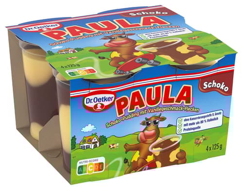 Leckerer Schokoladen-Pudding mit coolen "Kuhflecken" aus Vanillegeschmack-Pudding: Ein echtes Highlight für große und kleine Puddingfans! Perfekt als Dessert und für zwischendurch.Wie alle PAULA Puddinge punktet diese Sorte mit einem Nutri-Score B. Außerdem ist sie frei von Konservierungsstoffen laut Gesetz. Die vollmundige Rezeptur enthält mehr als 80% Vollmilch und verwendet ausschließlich Rainforest Alliance-zertifizierten Kakao.PAULA Schokoladen-Pudding mit Vanillegeschmack-Flecken gibt es im praktischen 4er-Pack mit 4 Bechern à 125 g Inhalt.