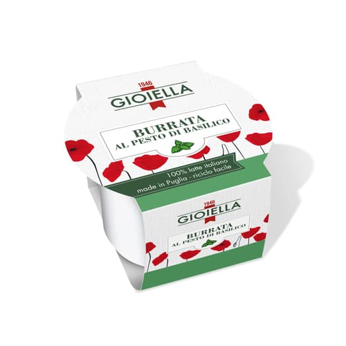 Die Gioiella Burrata Basilikum ist ein Frischkäse aus Kuhmilch mit einem weichen Kern aus Sahne und Mozzarella, verfeinert mit Basilikum. Sie eignet sich als Vorspeise, für Salate oder als Beilage zu mediterranen Gerichten.