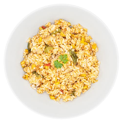 Zutaten: Gekochter Reis 38% (aus Reis und Trinkwasser), entbeinte Hühnerschenkel 17,8%, in Scheiben geschnittene dreifarbige Paprika 17,8% (rot, grün und gelb), Tomatenmark, Mais, Zwiebel, Sonnenblumenöl, Speisesalz, Knoblauch, Chilipulver, gemahlener schwarzer Pfeffer