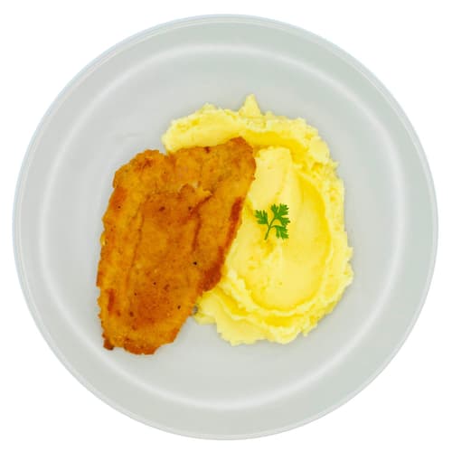 Zutaten: Kartoffelpüree 74% (gekochte Kartoffeln, Milch, Salz), Hähnchenfleisch im Triple-Wrap 26%