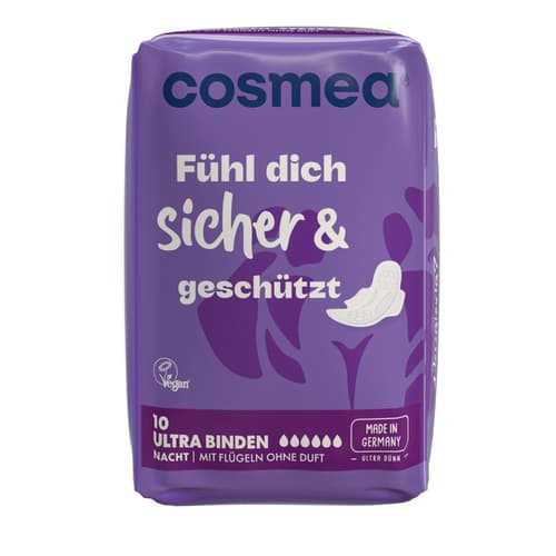 Unsere COSMEA Ultra-Binden Nacht mit Flügeln sind extra lang und besonders für die Nacht geeignet. So dünn, dass sie kaum zu spüren sind – und zugleich super sicher. Dank ihrer körpergerechten Form zeichnet sich die Binde nicht unter der Kleidung ab. Die seitlichen Flügel sorgen für optimalen Sitz und schützen zusätzlich Deine Wäsche. Unsere Ultra-Binden bieten optimalen Schutz durch ihre starke Saugfähigkeit und durch eine sichere Wäscheschutzfolie. Dank der atmungsaktiven, seidenweichen Oberfläche sind sie besonders angenehm auf der Haut und bieten höchsten Tragekomfort – einfach unspürbar.