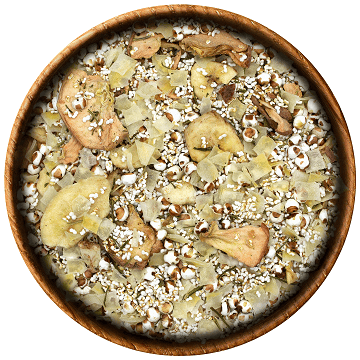 Zutaten: Kartoffelflocken, 20 % Amaranth (gepoppt), Hirse (gepoppt), Bananenstücke (getrocknet), Apfelstücke (getrocknet), Petersilie (getrocknet). Analytische Bestandteile: 8,2 % Rohprotein, 6,6 % Rohfett, 4,5 % Rohfaser, 2,6 % Rohasche.