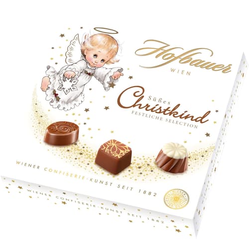 Die Hofbauer Süßes Christkind Selection vereint eine erlesene Mischung feiner Confiseriepralinen. In Milchschokolade, dunkler und weißer Schokolade umhüllt, bietet die Auswahl unterschiedliche Geschmacksrichtungen für festliche Genussmomente. Eine vielseitige Komposition für die Advents- und Weihnachtszeit.