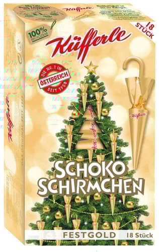 Die Küfferle Schokoschirmchen sind ein Klassiker, der seit Generationen für weihnachtliche Freude sorgt. Gefertigt aus zarter Milchschokolade mit fein gemahlenen Haselnüssen vereinen sie cremigen Schmelz mit einer feinen Nussnote. Das festliche Schirmchen-Design macht sie nicht nur zu einem Genussmoment, sondern auch zu einem feierlichen Hingucker im Advent. Ob im Nikolausstiefel, am Weihnachtsbaum oder als kleine Überraschung – die Schokoschirmchen versprühen festliche Stimmung und gehören einfach zur Weihnachtszeit dazu.