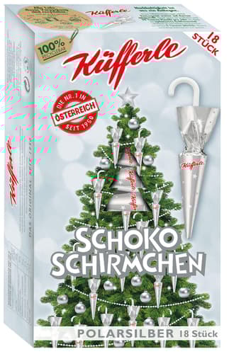 Die Küfferle Schokoschirmchen sind ein Klassiker, der seit Generationen für weihnachtliche Freude sorgt. Gefertigt aus zarter Milchschokolade mit fein gemahlenen Haselnüssen vereinen sie cremigen Schmelz mit einer feinen Nussnote. Das festliche Schirmchen-Design macht sie nicht nur zu einem besonderen Genussmoment, sondern auch zu Österreichs beliebtestem Baumschmuck. Ob im Nikolausstiefel, am Weihnachtsbaum oder als kleine Überraschung – die Schokoschirmchen versprühen festliche Stimmung und gehören einfach zur Weihnachtszeit dazu.
