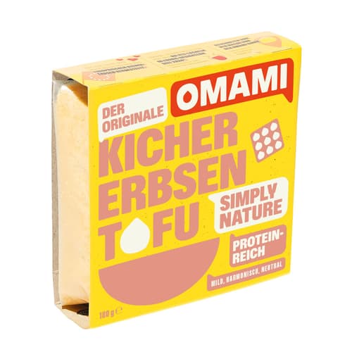 omami ist wie Tofu, aber aus ganzen Kichererbsen und umhüllt von einer verboten guten Marinade. Er wird ohne Soja produziert, steckt voller planzlicher Proteine, ist glutenfrei und zum Niederknien köstlich. How good is that?