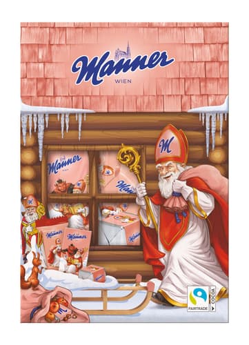 Das Manner Nikolo Haus enthält eine Auswahl der beliebtesten Manner Spezialitäten. In der festlich-verspielt gestalteten Geschenkschachtel befinden sich 3x Original Neapolitaner Minis, 3x Schokolade Täfelchen, 3x Milchschokoladewürfel mit feiner Nougatcreme sowie 1x Nikolo Milchschokolade. Damit bietet das Häuschen eine abwechslungsreiche Mischung für die Adventszeit.