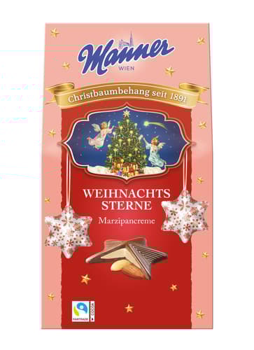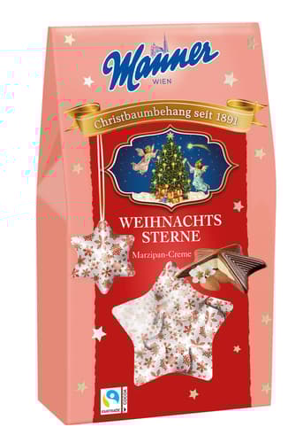 Die Manner Baumbehang Weihnachtssterne Marzipan bringen festliche Stimmung an den Christbaum. Die Sterne bestehen aus zarter Milchschokolade mit feiner Marzipanfüllung und sind einzeln verpackt sowie mit einer Aufhängeschlaufe versehen. Mit Kakao aus eigener Röstung und 100% Fairtrade-Zertifizierung verbinden sie weihnachtliche Tradition mit verantwortungsvoller Qualität.