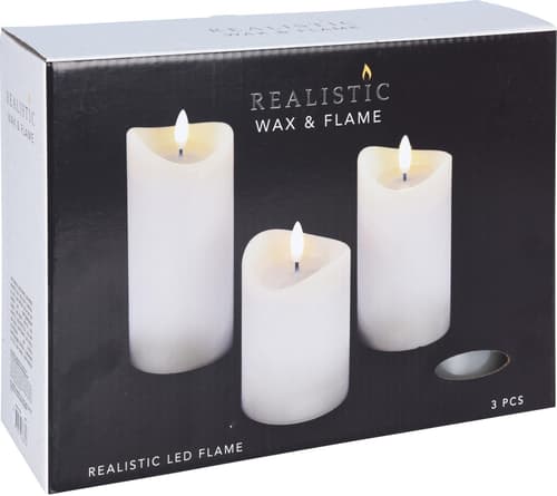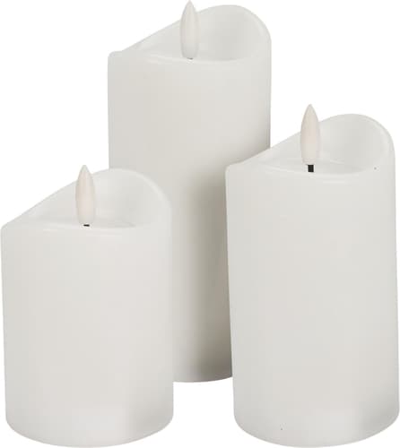 Dieses Set enthält drei dekorative LED‑Kerzen in klassischem Weiß. Sie simulieren ein flackerndes Kerzenlicht ohne offene Flamme und eignen sich für stimmungsvolle Beleuchtung im Innenbereich.