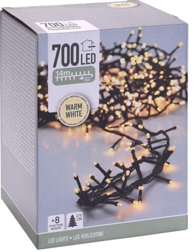 Diese Lichterkette verfügt über 700 warmweiße LEDs auf einer Länge von ca. 14 Metern. Sie eignet sich für dekorative Beleuchtungen im Innen- und Außenbereich, etwa an Weihnachtsbäumen, Geländern oder Fassaden. Häufig ist eine Timer‑ und Programmfunktion integriert.