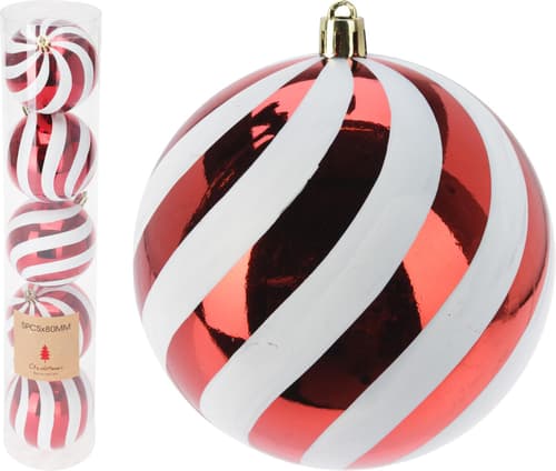 Dieses Set besteht aus fünf Weihnachtskugeln mit einem Durchmesser von 8 cm, gefertigt aus leichtem Polystyrol. Die Kugeln sind in weiß-roter Farbgebung gestaltet und eignen sich besonders für festliche Dekorationen an Weihnachtsbäumen oder Gestecken im Innenbereich.