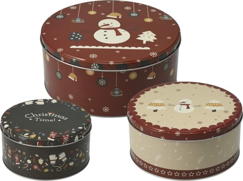Dieses dreiteilige Set umfasst runde Keksdosen mit weihnachtlichen Motiven. Sie sind ideal zur Aufbewahrung von Plätzchen oder Gebäck und gleichzeitig dekorativ in der Weihnachtszeit.