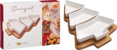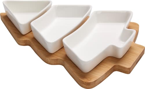 Dieses Servierset besteht aus vier Teilen in Form eines stilisierten Weihnachtsbaums. Es eignet sich zur Präsentation von Snacks, Dips, Süßem oder Häppchen bei festlichen Anlässen. Die einzelnen Elemente lassen sich oft anordnen oder zusammen präsentieren als Baumform.