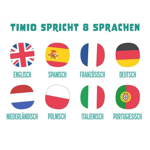 Mit 60 verschiedenen Audioaktivitäten zu 5 Themen bietet das TIMIO Starter Kit pro Sprache 90 Minuten interaktive Spielzeit und Spaß.