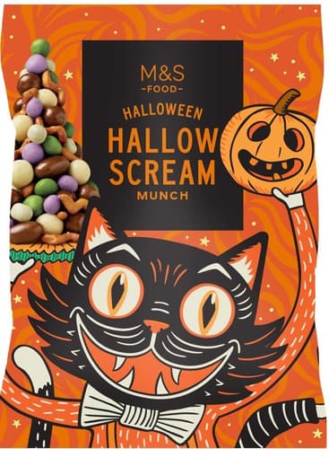 Ein Halloween‑Snackmix mit verschiedenen süßen und herzhaften Komponenten: schokoladenüberzogene Leckereien, saure Jelly‑Bohnen, knusprige Malz‑Kugeln, gesalzene Brezeln, Reis‑Crisps in Milchschokolade und weiche Brownie‑Stücke in weißer Schokolade.
