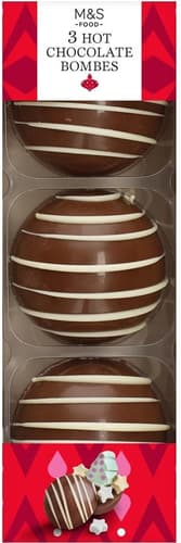 Die Hot Chocolate Bombes von Marks & Spencer bestehen aus drei hohlen Kugeln aus Milchschokolade, die jeweils mit Marshmallows gefüllt sind. Beim Übergießen mit heißer Milch schmilzt die Schokolade und ergibt eine cremige Trinkschokolade.
