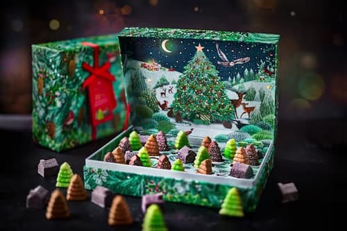 Die „Enchanted Winter Woodland“‑Schachtel von M&S gestaltet eine kleine Winter‑Waldlandschaft mit Milch‑, Weiß‑, Dunkel‑ und Blondschokoladen‑Stücken. Beim Öffnen erstrahlt eine Lichter‑Szenerie und es spielt ein Weihnachtslied.