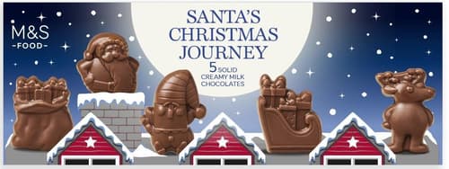 Die „Santa’s Christmas Journey Chocolate Shapes“ von M&S bestehen aus fünf festen Milchschokoladen‑Figuren in weihnachtlichen Formen – darunter ein Schlitten, der Weihnachtsmann, ein Rentier, ein Geschenkesack und ein fröhlicher Elf. Die Schokolade wird aus verantwortungsbewusst bezogenen Kakaobohnen hergestellt.