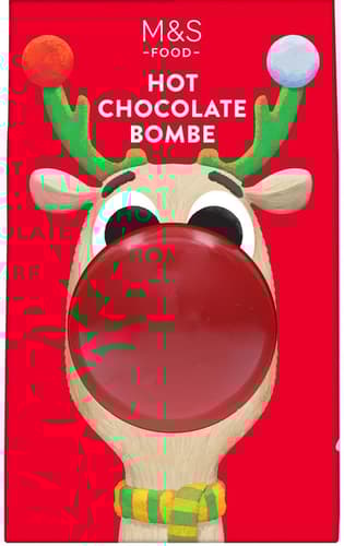 Die Reindeer Hot Chocolate Bombe von Marks & Spencer ist eine hohle Kugel aus Schweizer Milchschokolade, gefüllt mit Marshmallows. Man gibt sie in eine Tasse und übergießt sie mit heißer Milch — die Schokolade schmilzt und ergibt ein cremiges Heißgetränk.