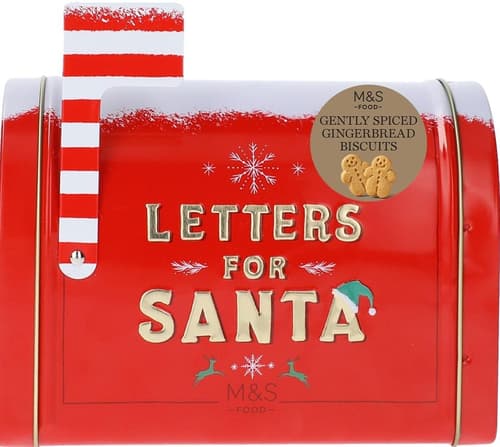 Die „Letters for Santa Tin“ von M&S ist eine Geschenk‑Dose mit weihnachtlich gewürzten Lebkuchen‑Biscuits und eignet sich gut als saisonaler Snack oder Geschenkidee.