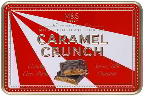 Die Milk Chocolate Coated Caramel Crunch von M&S besteht aus knusprigen Cornflakes, überzogen mit süßem Karamell und umhüllt von Schweizer Milchschokolade. Sie eignet sich als Snack für den Nachmittagskaffee oder als Teil einer Geschenkidee.