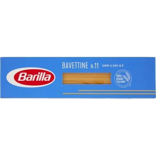 Barilla Bavettine sind dünne, längliche Teigwaren mit abgeflachter Form, eine kleinere Version der klassischen Ligurischen Bavette. Sie eignen sich besonders für feine, aromatische Saucen und leichte Gerichte.