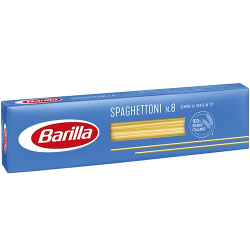 Barilla Spaghettoni ist eine längliche Hartweizenpasta, die dicker als herkömmliche Spaghetti ist. Sie eignet sich besonders für Saucen mit mehr Substanz und für Gerichte, bei denen Pasta und Sauce intensiver verbunden sein sollen.