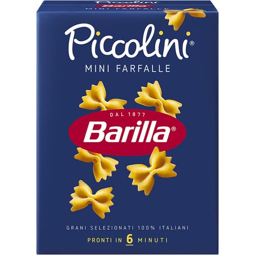Die Barilla Mini Farfalle (auch „Bow Tie Pasta“) ist eine verkleinerte Version der Farfalle‑Nudeln mit typischer Schleifenform. Sie eignet sich besonders gut für Pastasalate, dünne Saucen oder leichte Zutatenkombinationen.