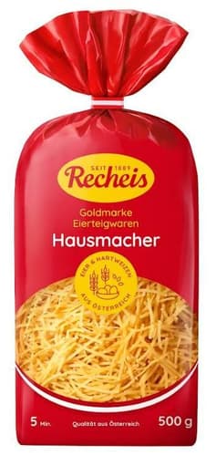 Recheis Goldmarke Hausmacher ist eine klassische Eierteignudel aus Hartweizengrieß mit Ei-Anteil. Sie wird traditionell als Suppeneinlage verwendet, passt aber auch als Beilage oder in Bandnudelgerichte.