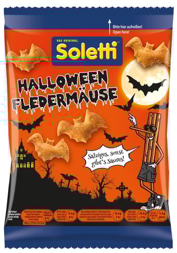 Die Soletti Halloween Fledermäuse sind knusprige Salzgebäcke in Form kleiner Fledermäuse – perfekt abgestimmt auf die Gruselzeit. Mit ihrer herzhaften Salznote bringen sie Abwechslung in jeden Snacktelle und eignen sich bestens für Filmnächte, Halloween‑Partys oder als Gabe für kleine Geister: Salziges, sonst gibt's Saures!