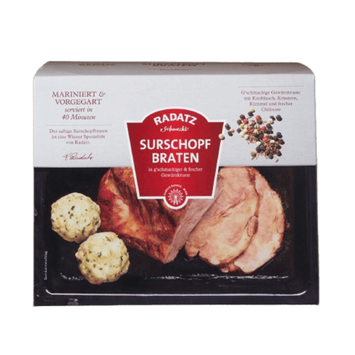 Ein echter Wiener Klassiker für eine schnelle, aber dennoch herzhafte Mahlzeit! Unser Surschopfbraten von Radatz ist bereits vorgegart, sodass er in kürzester Zeit zubereitet werden kann. Zart und saftig, ist er die ideale Basis für ein köstliches Mittag- oder Abendessen.