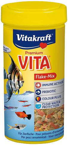 VITA® Flake-Mix garantiert Ihren Zierfischen eine umfassende Versorgung mit allen wichtigen Nahrungsbausteinen – für mehr Vitalität im Aquarium. Die Rezeptur des hochwertigen Flockenfutters wurde unter Berücksichtigung neuer wissenschaftlicher Erkenntnisse entwickelt und enthält neben wertvollen Zutaten wie Garnelen und Spirulina beispielsweise auch ein Prebiotikum, das die Darmflora unterstützt und eine optimale Futterverwertung fördert.