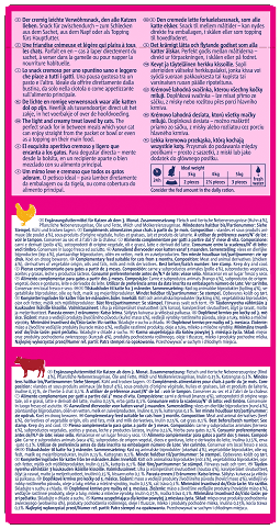 Zutaten: Huhn:, Fleisch und tierische Nebenerzeugnisse (Huhn 4%), Pflanzliche Nebenerzeugnisse, Öle und Fette, Milch und Molkereierzeugnisse, Rind:, Fleisch und tierische Nebenerzeugnisse (Rind 4%), Pflanzliche Nebenerzeugnisse, Öle und Fette, Milch und Molkereierzeugnisse, Inulin 0,15%, Katzengras 0,1%