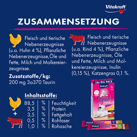 Enthalten sind 8 Sachets der Sorte Huhn + Taurin und ebenfalls 8 Sachets der Variante Rind + Katzengras. Der Liquid Snack mit bekömmlichem Huhn unterstützt dank enthaltenem Taurin noch die Augen- und Herzfunktion Ihrer Katze – die Geschmacksrichtung Rind mit Katzengras und Inulin unterstützt ganz nebenbei die Verdauung.