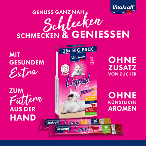 Von den herrlich leichten Liquid Snacks kann keine Katze genug bekommen! Denn die feine Creme schmeckt nicht nur unwiderstehlich lecker, sie überzeugt zudem durch einen echten Mehrwert fürs Tier. Wie praktisch, dass es das attraktive 16er-Multipack gibt!