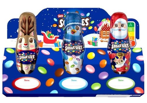 Die Smarties Mini‑Weihnachtsfiguren sind kleine Hohlfiguren aus Milchschokolade, gefüllt mit bunten Smarties‑Schokolinsen. Sie werden üblicherweise zur Weihnachtszeit angeboten und dienen als Geschenk, Dekoration oder kleine süße Überraschung.