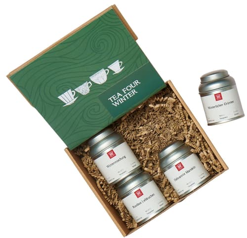 Vier niedliche Mini-Dosen, prall gefüllt mit Tees, die den Winter versüßen: „Gebrannte Mandel“ (ein aromatischer Früchtetee), „Winterlicher Grüntee“ (ein feiner aromatisierter Grüner Tee), „Wintermischung“ (eine harmonische Komposition aus Grünem und Schwarzem Tee) und „Rooibos Lebkuchen"
