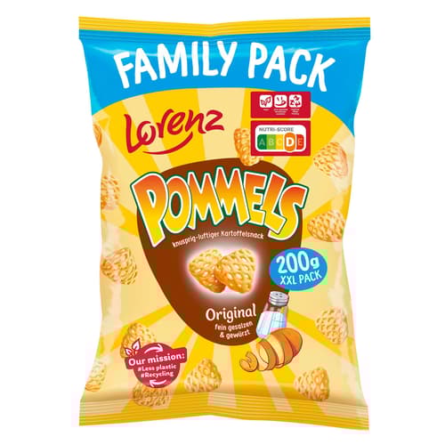 Der Lorenz Pommels Family Pack bietet den bekannten Gitter-Kartoffelsnack in einer extra großen Familienpackung. Mit ihrer luftigen Textur und dem milden Würzprofil eignen sich die Pommels perfekt für gemeinsame Snackmomente oder gemütliche Abende zuhause.