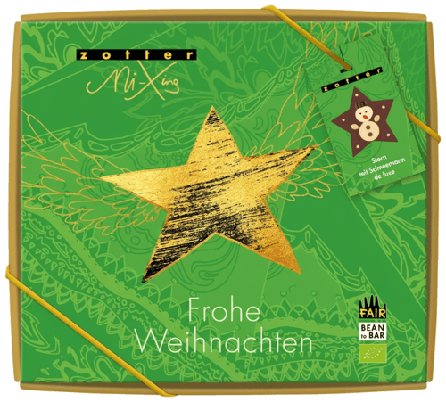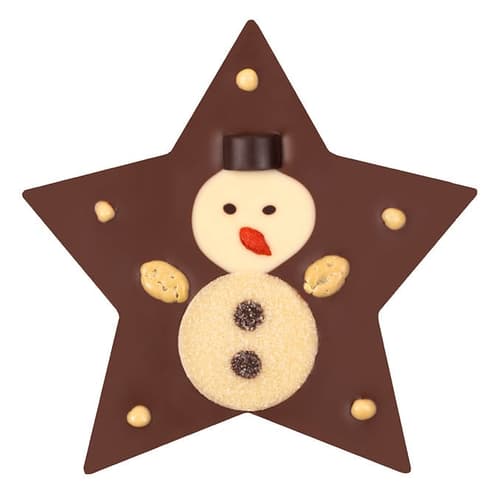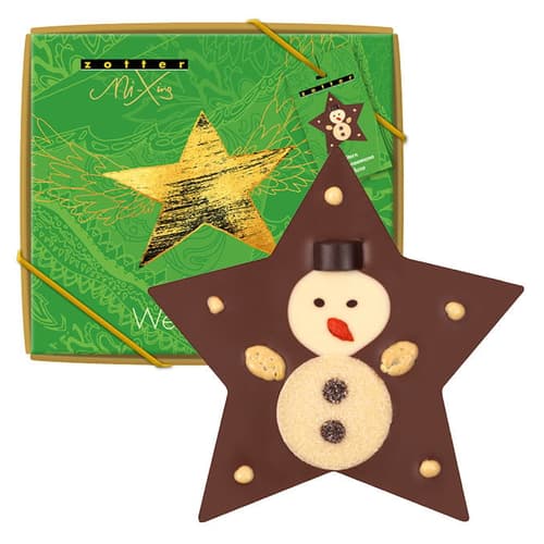 Der Zotter BIO Stern Schneemann de luxe ist ein festlicher Schokoladengruß, der winterliche Magie auf genussvolle Weise einfängt. In der Mitte des zarten Milchschokoladensterns strahlt ein kleiner Schneemann – liebevoll gestaltet mit glitzernder weißer Schokokugel, einer Gojibeere als Nase und Heidelbeer-Augen. Sein Zylinderhut aus Schokolade mit Nougatfüllung und die weißen Schokoperlen mit knackigen Kakaonibs rundherum machen ihn zu einem verspielten Blickfang, der nicht nur Kinderaugen leuchten lässt.