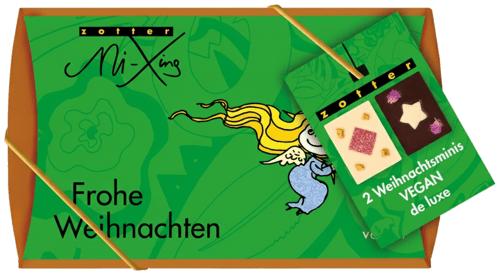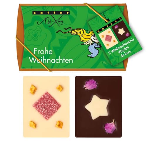Die Zotter BIO Weihnachtsminis vegan 2er vereinen festliche Stimmung und feinen Schokoladengenuss – ganz ohne tierische Zutaten. Zwei kleine Tafeln, liebevoll dekoriert und in einer weihnachtlichen Geschenkbox verpackt, sorgen für besondere Genussmomente in der Adventszeit oder als kleine Aufmerksamkeit zwischendurch.