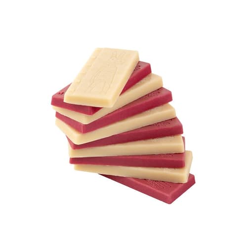 - Kombination aus Reis-basierter weißer Schokolade und Himbeer-Kokos-Kuvertüre.