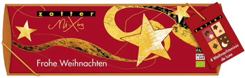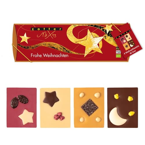 Die Zotter Weihnachtsminis de luxe 4er sind eine kleine Geschenk‑ oder Genusspackung aus vier verschiedenen Mini‑Tafeln in Bio‑Qualität. Enthalten sind Sorten mit fruchtiger, karamelliger, weißer und dunkler Schokolade – jeweils mit Dekor und teilweise gefüllt. Sie eignen sich als kleine Aufmerksamkeit oder zum Probieren unterschiedlicher Geschmacksrichtungen.