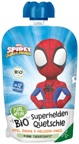 BIO-Fruchtpüree PURE & FUN Spidey Superhelden Quetschie ist eine praktische und leckere Zwischenmahlzeit für Kinder. Das Fruchtpüree besteht aus Apfel und Banane, kombiniert mit Vollkorn-Dinkel, und bietet eine ausgewogene Mischung aus Geschmack und Nährstoffen.