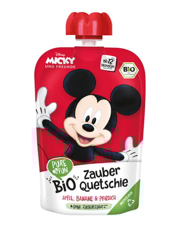 PURE & FUN BIO Micky Zauber Quetschie ist ein Bio-Fruchtpüree aus Apfel, Banane und Pfirsich. Es bietet eine praktische und leckere Möglichkeit, Kindern eine Portion Obst zu geben.