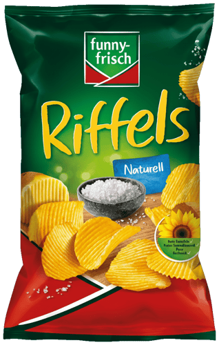 Funny Frisch Riffels Naturell sind geriffelte Kartoffelchips mit einem klassischen, mild gesalzenen Geschmack. Die Riffelstruktur sorgt für einen besonders knusprigen Biss und unterstreicht das schlichte, unverfälschte Aroma. Ideal für alle, die Chips ohne zusätzliche Würzung bevorzugen.