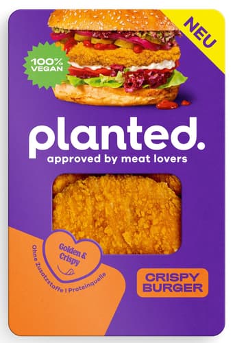 Unser planted.burger crispy liefert das ultimative Comfort-Food-Gefühl, das wir alle lieben – mit einer goldenen, extra-knusprigen Panade und einer saftigen, hähnchenartigen Textur, die bei jedem Bissen überzeugt.