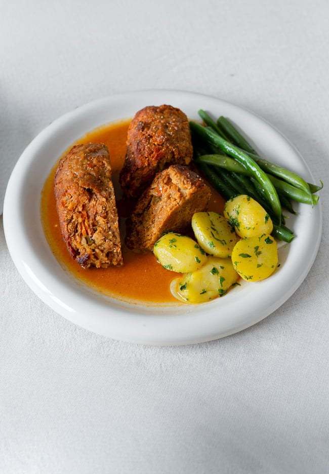 MITZL, G’FÜLLT – DIE VEGANE VLEISCHROULADE MIT VEGANEM SPECK, KAROTTEN, WURZELPETERSILIE UND GURKERL